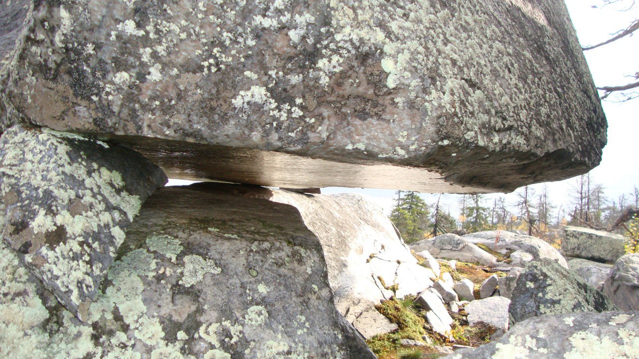 Один из сейдов: крупный валун лежит на 3 небольших камнях, которые, в свою очередь, лежат на другом крупном валуне. Слева внизу можно увидеть человека для сопоставления размеров
