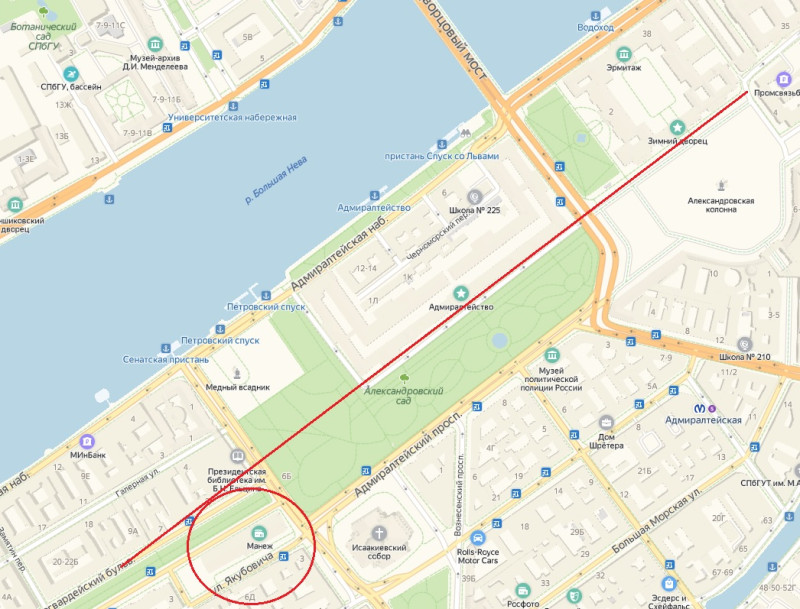 Вот план того что по факту. В красном овале Манеж. Если бы Монферран рисовал с натуры он бы на месте Манежа нарисовал здание Сената и Синода, а не Манеж.