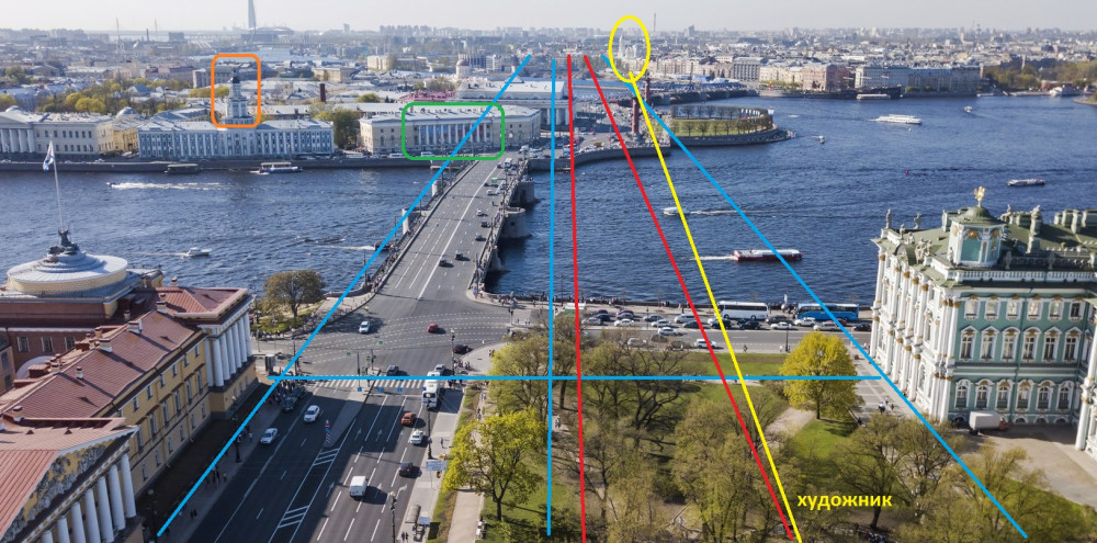 На картинке Монферрана я синим крестом дал точку проекции. Вертикальная линия это ось симметрии, горизонтальная для определения местоположения художника в проекции между Адмиралтейством и Зимним дворцом. По версии Монферрана художник находится на одной четвертой расстояния от дворца. Это середина креста. На панораме место художника я подписал желтым цветом, а ось симметрии обозначена красными вертикальными линиями. Левая вертикальная это середина, правая вертикальная это проекция с точки зрения Монферрана (художника). Голубые линии на панораме это проекции для понимания картинки. В общем что получается. А получается что художник в версии Монферрана эту картинку с натуры не рисовал, а всё слепил как ему вздумается. Начнем с Владимирского собора, он на панораме в желтом овале, а у Монферрана в синем овале. Синим отрезком от овала (получилось как ручка лупы) я показал место где на картинке должен быть собор, между Ростральными колоннами, частично заступая за дальнюю колонну. У Монферрана собор справа от колонн, как если бы художник находился вдоль стен Зимнего дворца (правая голубая линия на панораме). При этом сам собор должен быть чуть виден, ибо достаточно далеко. Для наглядности фото с яндекса.