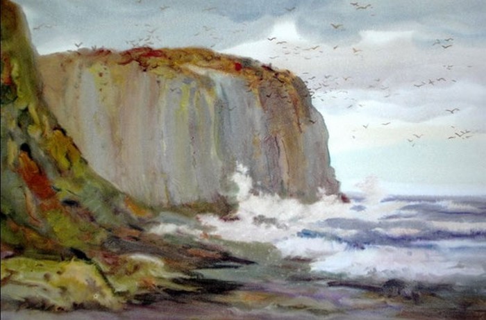 На замечательной картине красноярского художника есть все, скала, море, птицы, растительность, умеющая ценить короткое арктическое лето природа, запах моря, свежий ветер..Нет только одного - вот этих полос от гигантского "фигурного шпателя", коим придали оконечности острова закругленный вид заботливые руки хозяев планеты.Ну или нанятого ими мега-ландшафтного мега-дизайнера.Причем, создается ощущение что либо шпателем работали по мягкому материалу, либо инструмент таков, что для него существующее состояние скалы не требует размягчения..
