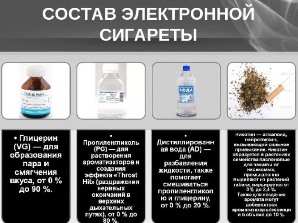 Эксперты установили, что основными компонентами раствора, помимо никотина, являются пропиленгликоль, глицерин, ароматизирующие вещества, формальдегид и другие, вызывающие рак, вещества.