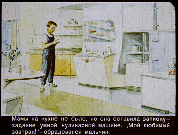 Пользователи социальных сетей с наступлением нового года раскопали в своих загашниках старинный диафильм (разновидность слайд-шоу с титрами) «В 2017 году». Его авторы в доходчивой форме попытались рассказать советским детишкам, каким станет мир спустя 57 лет в годовщину Великого Октября: роботы, видеосвязь, космические путешествия, атомные поезда.
