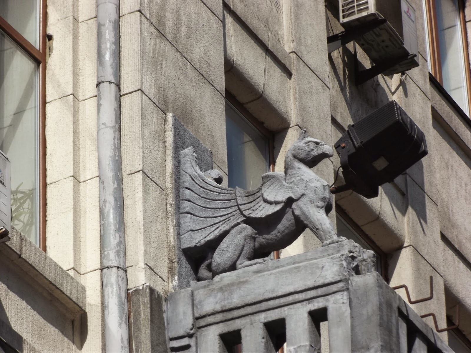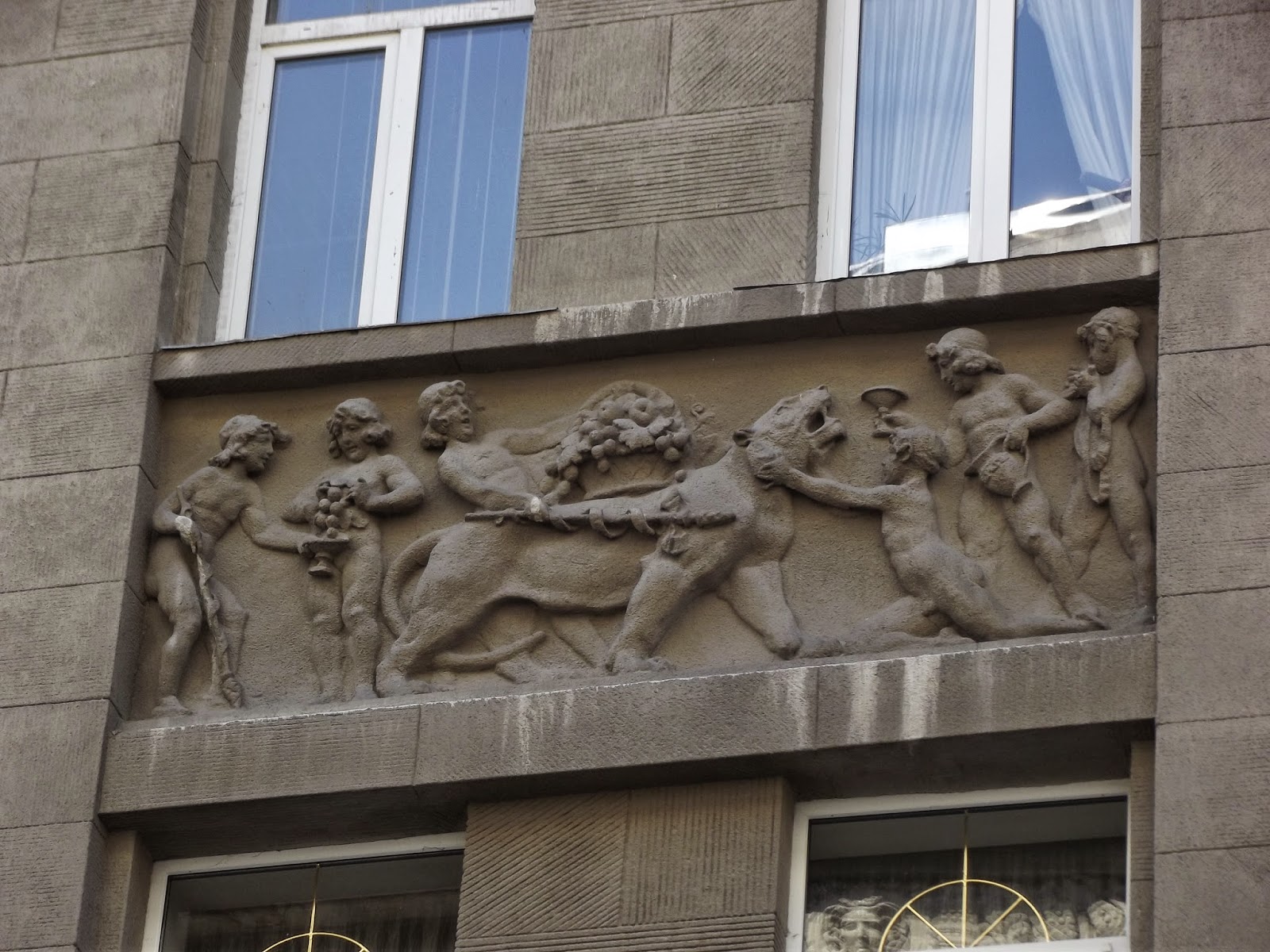 «Даю голову на отсечение, что ни один из многих тысяч жильцов этого дома не знает, что же изображено на его фасадах. Более того, смею утверждать, этого не знает ни один киевлянин, даже ни один житель земного шара, кроме разве что авторов проекта (если они ещё живы) и... меня...детишки на барельефах вовсе не играют со львом и львицей, они просто-напросто... спаивают их. Да, спаивают! Одни раскрывают ему пасть и подносят чашу с вином, наливая его из какой-то амфоры. Другие же малыши с гроздьями винограда в руках приготовляют вино. А двое даже дегустируют его... Вот о каких интересных вещах рассказал нам Андреев...».