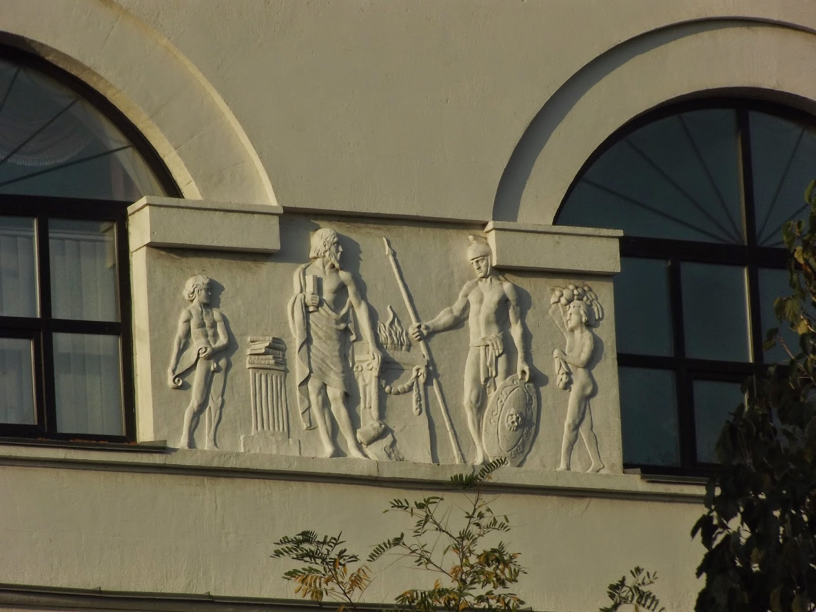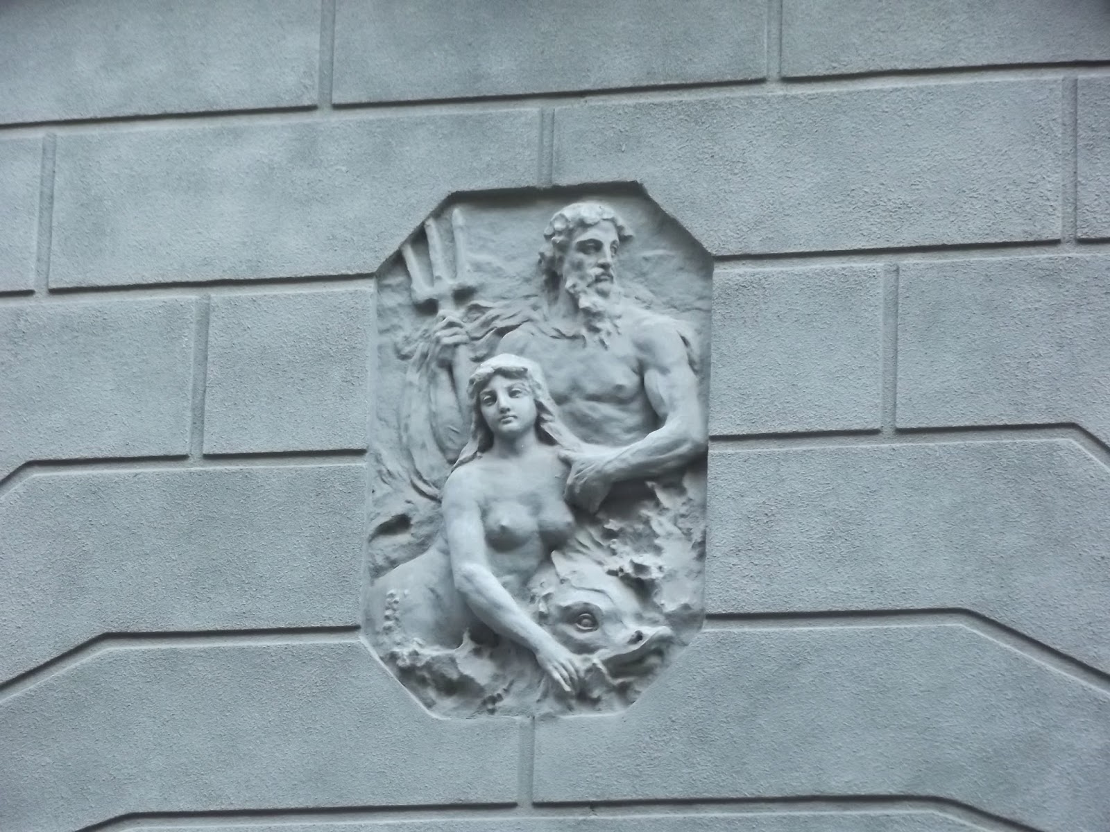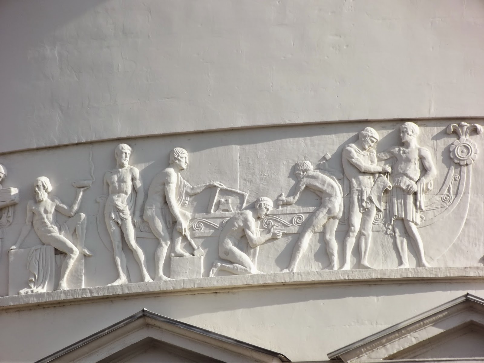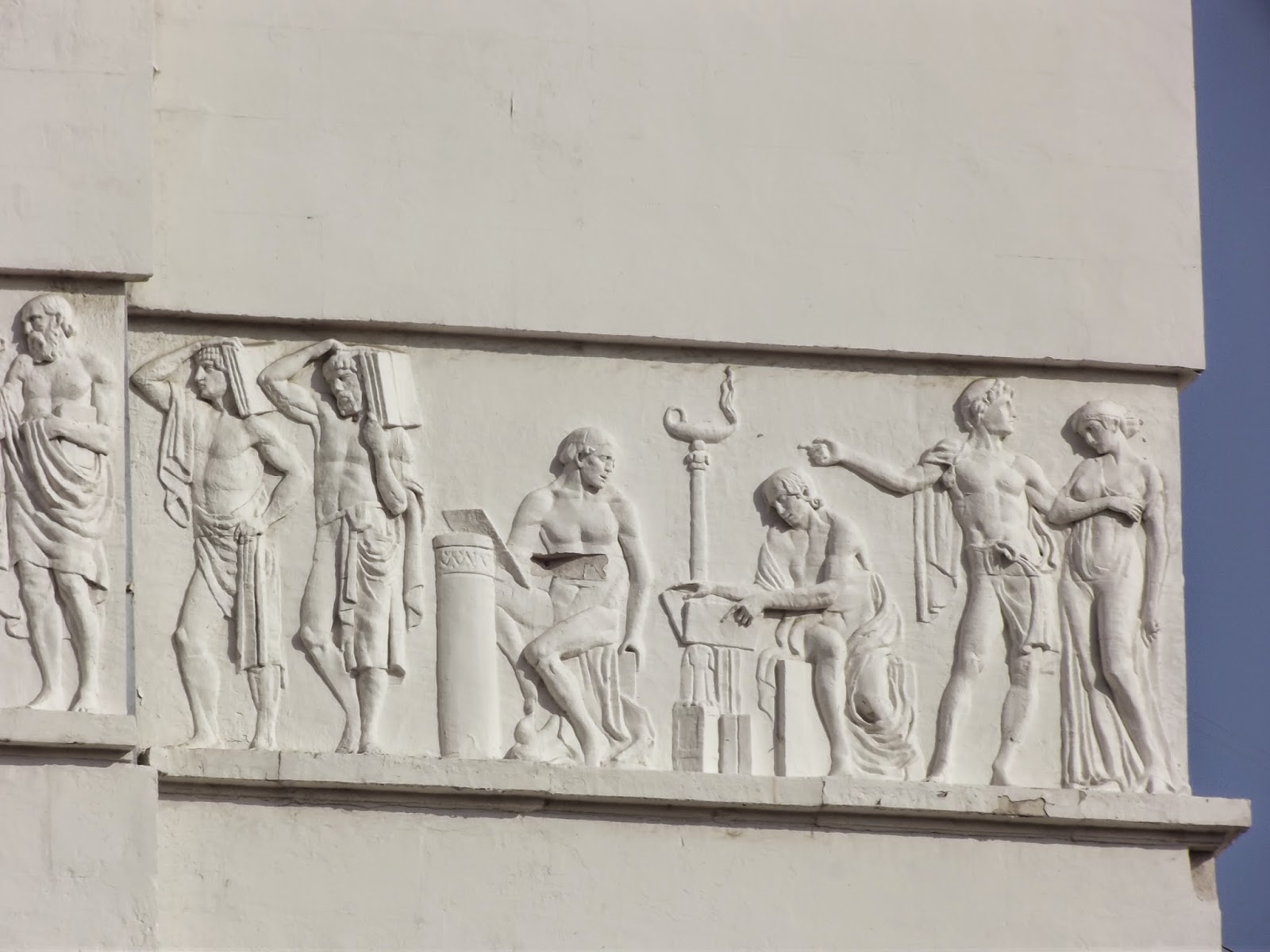 Олицетворение торговли - в центре Меркурий, покровитель торговли, а вокруг люди с амфорами и всяческими явствами. Не исключена возможность полной или частичной реставрации барельефов, по факту так.