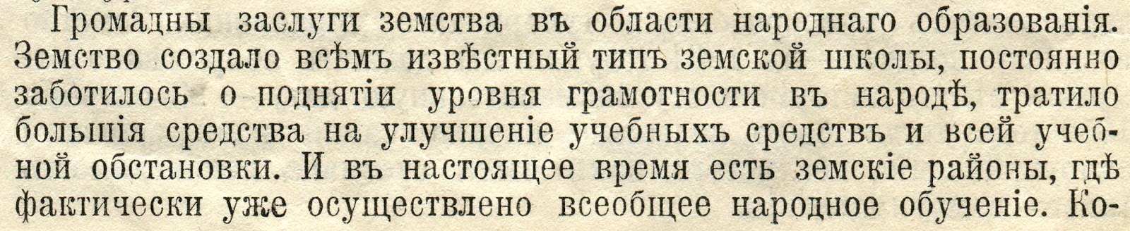 В начале 1913 г. общий бюджет народного просвещения в России достиг по тому времени колоссальной цифры, а именно 1/2 миллиарда рублей золотом. В 1914 году было 50 000 земских школ с 80 000 учителями и 3 000 000 учеников в них (помимо церковно-приходских школ). В 1914 году в земствах было создано 12 627 публичных библиотек.