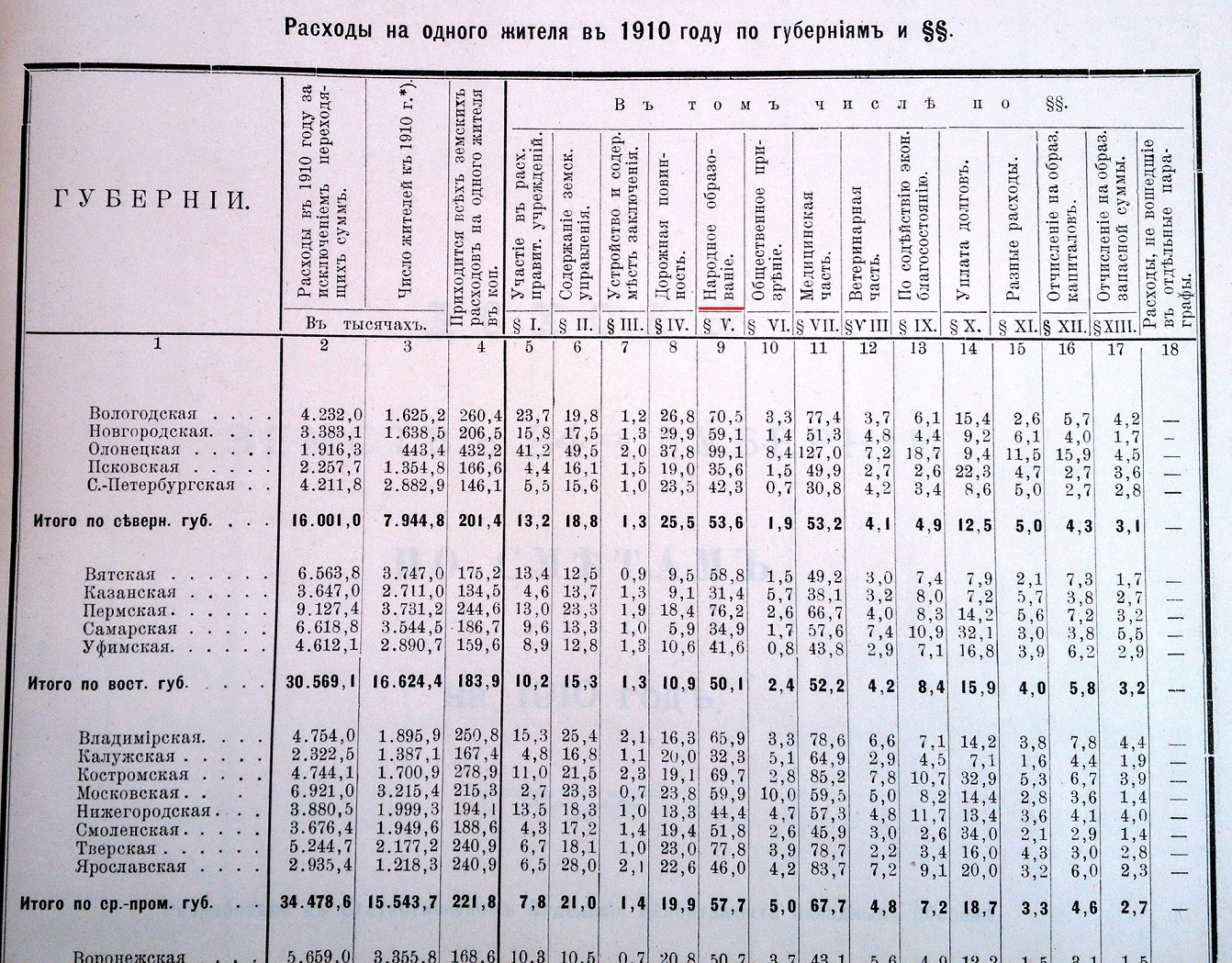 Из всех статей бюджета , расходы земств на народное образование стояли на втором месте после расходов на медицинское обеспечение народа (самая высокая статья бюджета) и к 1910 году выросли в течении 15 лет на 356,7 %.